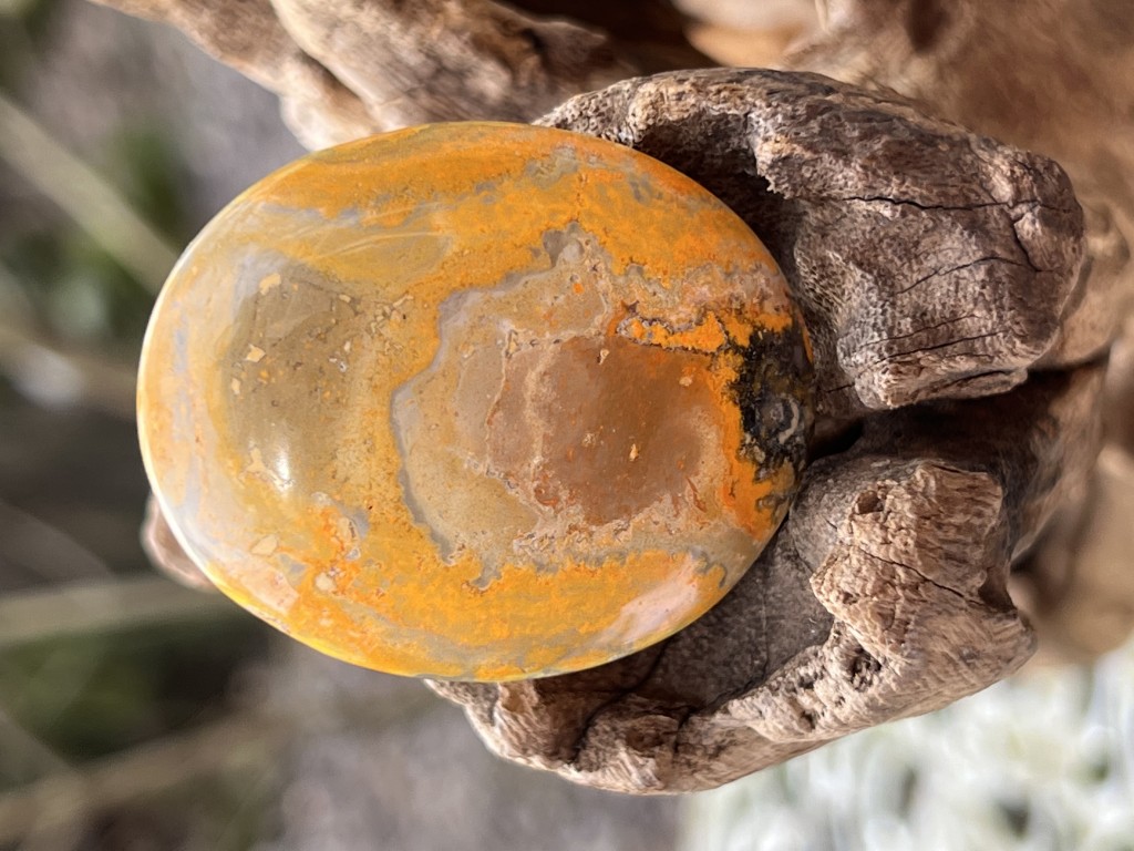 A gorgeous bumblebee jasper palm stone weighing approx 53g and measuring 52:42:17mm. The intensity of the Orange yellow and mix of golden shades show just how clever nature is at making beautiful stones. The listing is for one. Healing Stone for the Sacral and Solar Plexus Chakra Intensity : Creativity : Inspiration Bumblebee Jasper is an excellent companion for the journey of life. It strongly stimulates the sacral and solar plexus chakras, freeing any blocked energies in these areas so that one may fully manifest the things they feel a calling to do. The energy flow here brings high levels of inspiration and intensity into one’s creative energy. This will inspire one to pursue new projects and increase one’s power of persistence to not give up despite any obstacles that may interfere. This is especially effective when one is pursuing something deeply meaningful to them. These metaphysical properties of Eclipse stones are known to assist you by enhancing your creativity and may be advantageous if used in combination with other stones that boost creativity. These stones resonate within the solar plexus chakra and may help to ease stress and worry related to others opinions of you. They are also said to help to stimulate mental clarity. They have a number of excellent healing attributes, including helping those who have allergies, as well as aiding healing of the organs governed by the sacral or navel chakra.