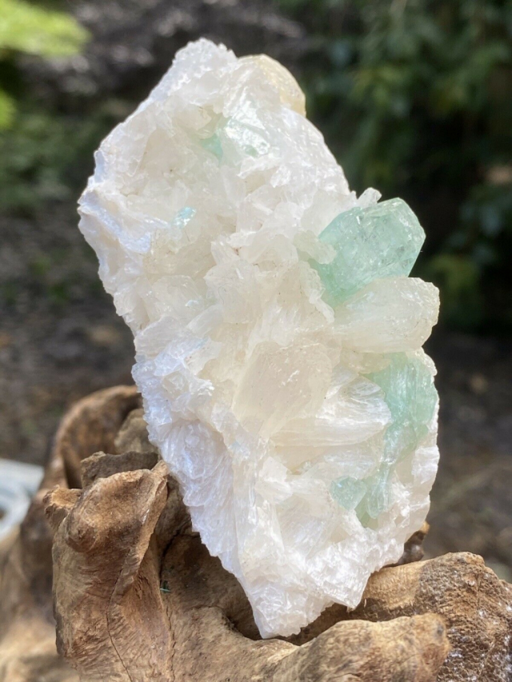 Green Apophyllite Rare Cluster With Stillbite beautiful, gemmy and rare. Multi pointed pyramid points. Large double deep green pieces on this cluster and large Stillbite flower. Direct from India. Weighing 139g and measuring 97:46:40mm
