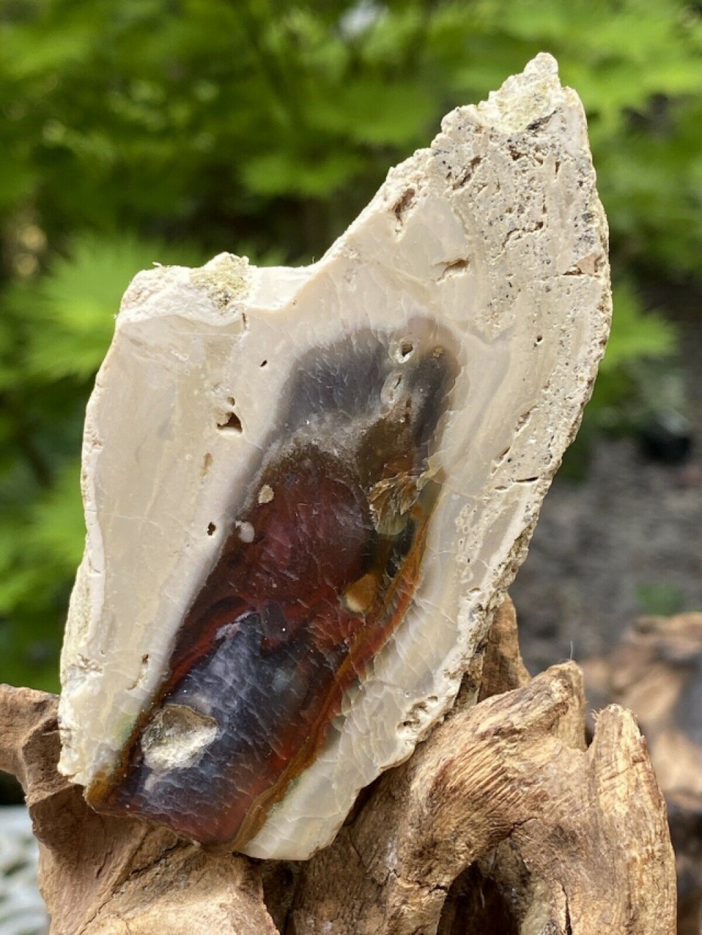 The opalized brownish color on the outside of the stones is obviously petrified wood, but magic is inside . . . the lush, rich blue is feathered with manganese and native copper dendrites, some which look like snowflakes or feathers.