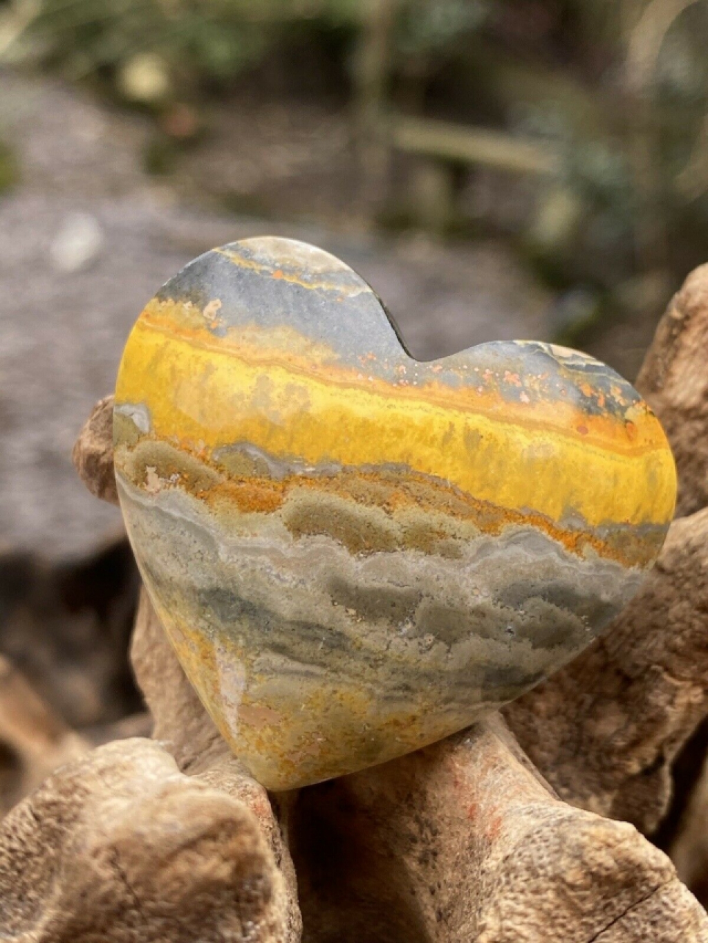 A gorgeous bumblebee jasper heart weighing 40g approx and measuring 44:43:21mm approx . The intensity of the yellow and mix of grey and golden shades show just how clever nature is at making beautiful stones.