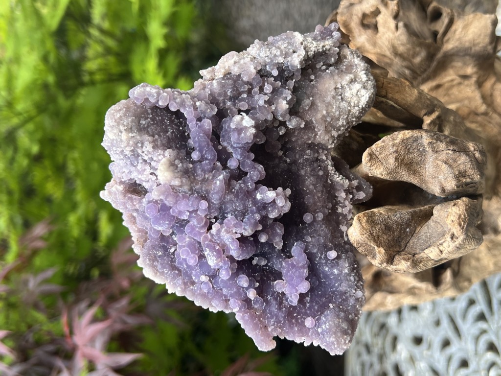Grape Agate Specimen Large 542g and measuring 119:113:49mm. Grape Agate Grape Agate gemstone is a relatively new find. Although the trade name is Grape Agate, these are actually Botryoidal Purple Chalcedony. Botryoidal means that round tiny sphere shaped crystals that have naturally formed together. Grape agate is a tranquil and gentle stone. Chalcedony is not scientifically its own mineral species, but rather a form of Quartz in microcrystalline form. Chalcedony is a cryptocrystalline form of silica, composed of very fine intergrowths of quartz and moganite. Chalcedony has a waxy luster, and may be semitransparent or translucent. It can assume a wide range of colors, but those most commonly seen are white to gray, grayish-blue or a shade of brown ranging from pale to nearly black. Chalcedony is quite varied in its formation habits. It sometimes occurs in geodes, lining the cavity with mammilary blobs. Its Agate variety is also found in geodes, commonly lining the outer layer underneath the larger Quartz crystals. Chalcedony also forms pseudomorphs after organic material. A well-known example is petrified wood, in which the wood has been completely transformed into Chalcedony. In the Petrified Forest National Monument in Arizona, an entire forest was transformed into petrified wood. Remains of this ancient forest can be seen in the huge silicafied logs that are found in the area.