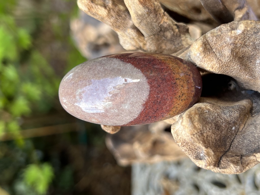 Large Shiva Lingam Holy Mountain Stone India weighing 59g & measuring 53:26:26mm. Shiva Lingam is a tough crypto-crystalline Quartz with impurities that give it a very unique appearance. This stone has iron oxide deposits within it, said to come from a meteor that crashed into the river millions of years ago. It contains a mixture of Agate, Basalt, and Jasper. The color of this stone is primarily grey or pale brown with brown-red patches, stripes, or rings throughout. No two Shiva Lingam stones are alike, each one is unique. The most defining characteristic of Shiva Lingam is its smooth egg shape which is formed from natural tumbling within the Narmada River, where it is gathered and hand polished by villagers. The Narmada River is one of the seven holy sites of India, and one of the five holy rivers, located in Onkar Mandhata (in western India). Shiva Lingams represent the beginning of all creation and are physical manifestations of divine male and female energies. They embody the masculine energies through their solid oval shapes and the feminine through their many unique patterns. It is through this formation that they are able to link to the force of creation, just as humans can physically birth new life through connection of the male and female bodies. Shiva Lingam aids in understanding polaric energies such as male/female, light/dark, and spiritual/physical so that one may see the one unifying force of God that exists behind them. This helps one to heal and bring each polarity together within the self so they may work in harmony, bringing one to a state of self acceptance as well as acceptance of the differences in others and in all of creation. The deep connection that Shiva Lingams have to creation give them a powerful resonation with all elements. They carry with them a strong connection to the earth element, so strong that it provides a deep link with the Earth itself for a pure connection and understanding of the planet we call home. Water itself is able to change shape and the Lingams have been shaped by the water. This is an intimate bond that is held within the stone, allowing one develop emotional and spiritual knowledge of great depth. It provides the cleansing effects of water and has a gentle cooling effect on the body. One may notice an influx of intuitive insights as well when working with a Shiva Lingam. Although it can easily cool the body, this stone is able to pick up and store heat very quickly. It contains immense fire energy within it which can be felt as it energizes the entire body and auric field. The fire energy in this stone is so intense that it can immediately activate Kundalini energy and ignite the soul. When meditating with Shiva Lingam one can feel this intense energy moving from the base of the spine all the way to the top, moving the sacred energy within through the chakra column and activating every chakra along the way. This also provides an incredible boost to vitality and prana. Prana is the breath of life - originally coming from God source to the human body at birth. We breathe this breath every day of life and through breathing we can work closely with the element of wind. When meditating with Shiva Lingam one may notice an increase in the amount of air that one can breathe in. When paired with pranic breathing techniques, this becomes further amplified and allows one to bring out the full force of the wind element within the stone and in one’s own body. Shiva Lingam’s resonance with wind can also be felt by simply holding the stone and rolling it around in your hands. It has a lofty/airy feel to it that helps to soothe the mind. Shiva Lingams are overall transformative stones and contain the storm element as well. They supercharge the body’s electromagnetic field and greatly enhance chakra flow through all vital points in the body. This allows one to hone in on inner transformation through realizing the patterns, beliefs, and habits that are holding one back from their greatest purpose.