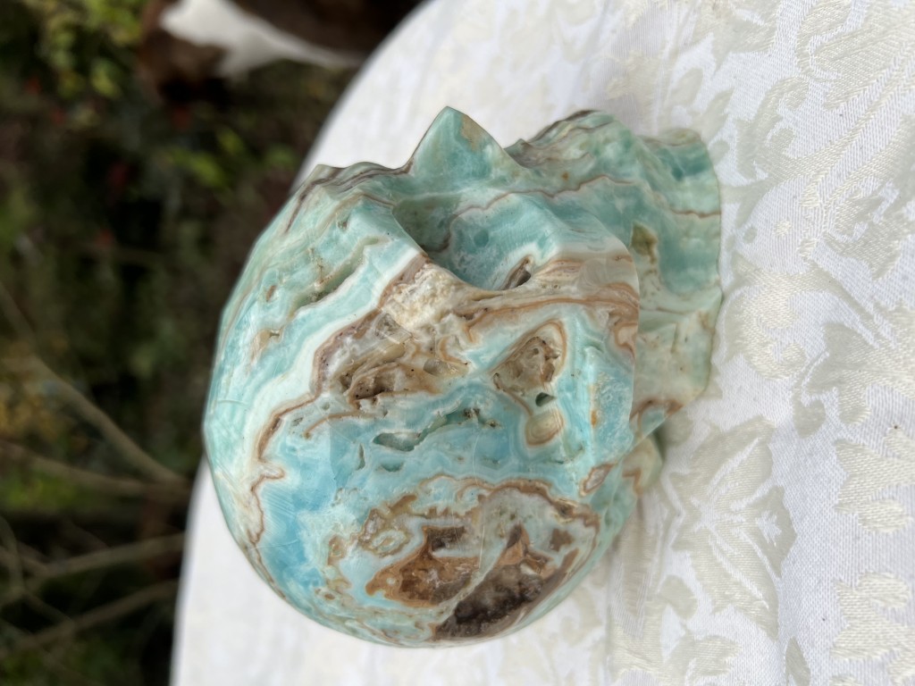 Blue Aragonite Crystal skull 1917g and measuring 136:92:96mm Blue Aragonite is such an interesting crystal to have for sale, quite unique in its formation, a gorgeous blue often giving way to brown hues underneath and lovely caves which are quite natural in this crystal. Please study all photos carefully as these stones do have natural imperfections which to me add to its beauty. Blue Aragonite Healing Stone for the Throat Chakra Hope : Compassion : Empathy Blue Aragonite is a variety of Aragonite that crystallizes in orthorhombic or acicular formations. It's commonly found in Austria, Greece, Mexico, China and Morocco. It has a hardness of 3.5 to 4 on the mohs scale. Blue Aragonite is mainly sold on the market as raw, tumbled pieces, or shaped into beads. Every so often jewelry and extremely high grade specimens become available, but usually sell almost instantly due to the sheer beauty of this stone. As well as sharing the same transformative and chakra balancing properties as normal Aragonite, Blue Aragonite helps one calm and soothe their emotional body. Simply holding a piece will imbue ones aura with a sense of relief and relaxation that can’t be put into words. One becomes more open with themselves and their “hidden” emotions, slowly overtime releasing these weights to the surface to be faced. Blue Aragonite is a very special stone that is here to soften emotional transitions. This could stem from traumatic events that we refuse to deal with, to mourning the loss of someone and not being able to cope with grief, as well as just having trouble getting over a recent falling out in a serious relationship. This stone will become your best friend in times of need as it will “soften” even the most hurtful emotions and events we relive day in and day out. Working with or carrying this stone daily will provide ones aura with powerful vibrations that can even be felt by the ones closest to us. Blue Aragonite has a special relationship when it comes to the throat chakra. It helps communicate emotional pain and struggle we refuse to confront. This stone pushes us to vocalize our feelings when in times of discomfort, as one may normally just shell up and stay quiet. By all means this is not an aggressive vocalizing stone, and is purely here to help in vocalizing ones emotional pain. So often do we hold on to pain because we refuse to even communicate about it to the ones closest to us. Blue Aragonite will passively push you to speak up about yourself and stand up for your emotions. Something as little as using different words with a different tone can change the outcome of any discussion or confrontation. We recommend meditating with a heart stone such as Rose Quartz, Rhodochrosite, or Green Calcite with Blue Aragonite. Carrying a heart stone or working with one in conjunction with Blue Aragonite can have powerful effects when opening the heart space. These stones together will help one have an inner evaluation of their emotional well-being and weight we constantly put on our hearts. Using these stones overtime will help in keeping the heart space cleared of all negative emotions. This space and energy can now be used for what we each truly desire the most.