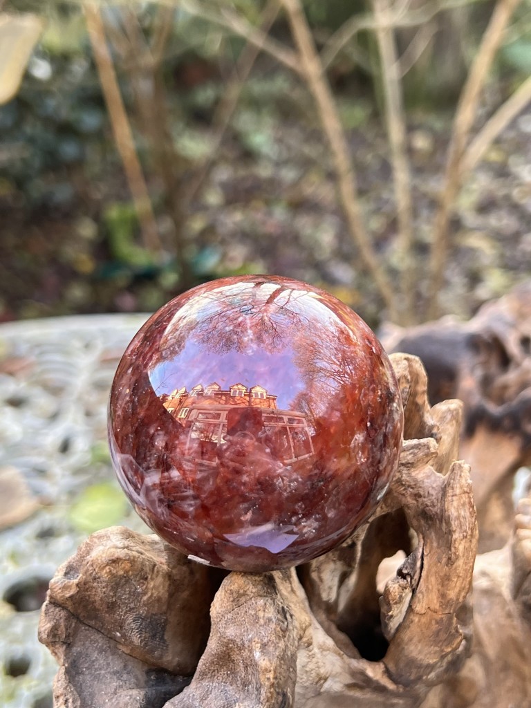 Hematoid Quartz Crystal Ball weighing 278g and measuring 59mm diameter. Hematoid Quartz is a powerful grounding crystal, drawing 'chaotic' and stray energies down into the root chakra. Hematoid Quartz can assist in balancing polarised opposites of emotion and thought. Hematoid Quartz assists one accept and integrate the shadow self. Hematoid Quartz can be used to manifest dreams into physical reality. Hematoid Quartz transforms negativity into tranquillity and clarity.