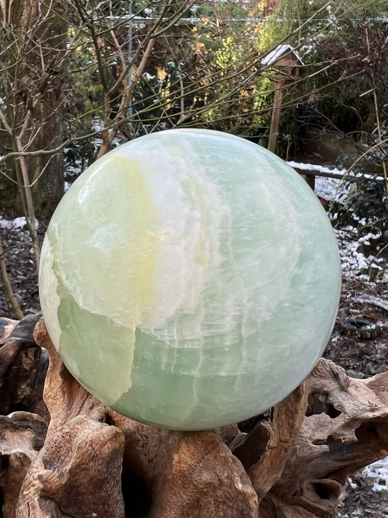 Pistachio Calcite crystal ball weighing 576g and measuring 71mm diameter. A relatively new mineral find from Pakistan, the sea greens and sometimes sandy sediment make these a real joy to behold and a heart soother. It’s an absolute joy to be able to offer these for sale. Pistachio Green Calcite facilitates physical healing by clearing negative emotions and encouraging relaxation. ... If you need to restore yourself, meditation with calcite is highly recommended. Restoring balance is critical to your well being Pistachio green calcite is a grounding and centering stone that brings stability. ... It increases success, prosperity, business, and fertility of all kinds. It is an excellent stone for gardening. Green Calcite can be used to assist in the manifestation process. Green Calcite will also bring in the energy of trust, allowing that what has been manifested will be received. It is a wonderful stone to utilize for those who raise and tend to gardens, plants, and herbs. Use Green Calcite when working with the Heart Chakra to bring emotional balance and knowledge of Divine Love. Great for body layouts, Green Calcite can be placed directly on the Heart Chakra to forge a better connection between the nadis (energy channels) and chakras. Helpful for reaching mental balance, Pistachio Green Calcite helps to dissolve old energy patterns and beliefs that may be holding you back. Pistachio Green Calcite assists during times of mental change or big transitions. Use Pistachio Green Calcite to help release the comfortable, old programs that you may be holding on to but which no longer serve you. A peaceful stone, Pistachio Green Calcite can help one to look at situations differently, with the knowledge that, whether good or bad, "This too, shall pass". Physically, Pistachio Green Calcite stimulates the immune system. Rigid old ideas can manifest as bone issues in the body, thus Pistachio Green Calcite is useful for bone, ligament, and joint issues. Please note that Green Calcite should be cleansed thoroughly after use.