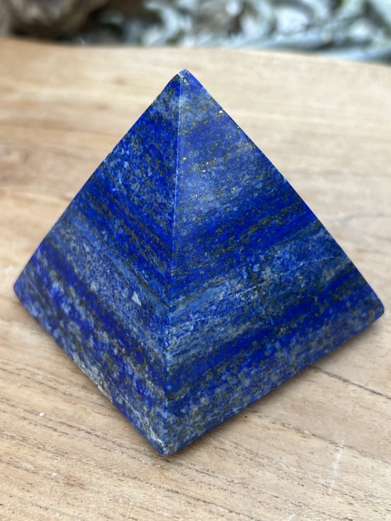 Lapis Lazuli pyramid weighing 251g and measuring 60:60:60mm. Deep blue tones to this pyramid. The deep soothing blue that has been a jewel throughout history. This is the exact crystal that you’ll receive. Lapis lazuli : Healing Stone for the Throat Chakra Serenity : Peace : Self Knowledge This Stone is a bringer of deep peace and contentment, it brings serenity and harmony. A stone for aiding depression, it can bring a deep self knowing and reveals our inner truth. It brings qualities of compassion, honesty and truthfulness to the forefront. Lapis lazuli helps us confront truth wherever we find it and aids thought and clarity and encourages us to use our mind for creativity. Lapis lazuli helps express feelings and deepens bonds of love and friendship.