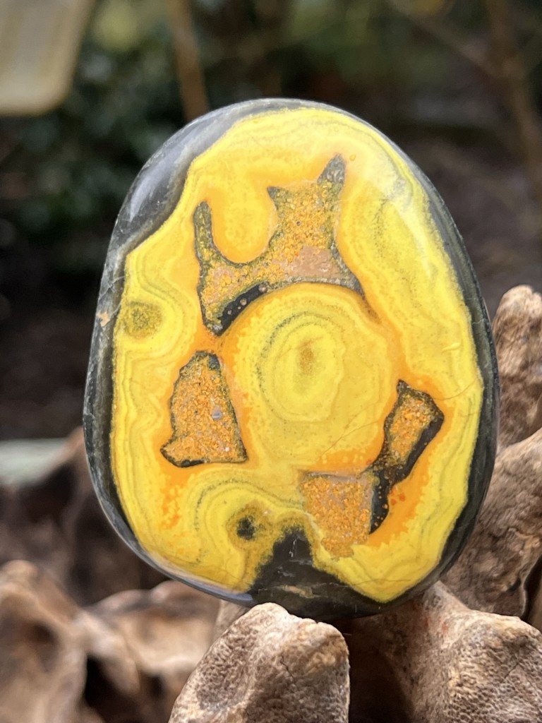 A gorgeous bumblebee pebble weighing 117g and measuring 69:55:20mm. intensity of the yellow and mix of grey and golden shades show just how clever nature is at making beautiful stones. This is the one you will receive. Healing Stone for the Sacral and Solar Plexus Chakra Intensity : Creativity : Inspiration Bumblebee Jasper is an excellent companion for the journey of life. It strongly stimulates the sacral and solar plexus chakras, freeing any blocked energies in these areas so that one may fully manifest the things they feel a calling to do. The energy flow here brings high levels of inspiration and intensity into one’s creative energy. This will inspire one to pursue new projects and increase one’s power of persistence to not give up despite any obstacles that may interfere. This is especially effective when one is pursuing something deeply meaningful to them. These metaphysical properties of Eclipse stones are known to assist you by enhancing your creativity and may be advantageous if used in combination with other stones that boost creativity. These stones resonate within the solar plexus chakra and may help to ease stress and worry related to others opinions of you. They are also said to help to stimulate mental clarity. They have a number of excellent healing attributes, including helping those who have allergies, as well as aiding healing of the organs governed by the sacral or navel chakra.