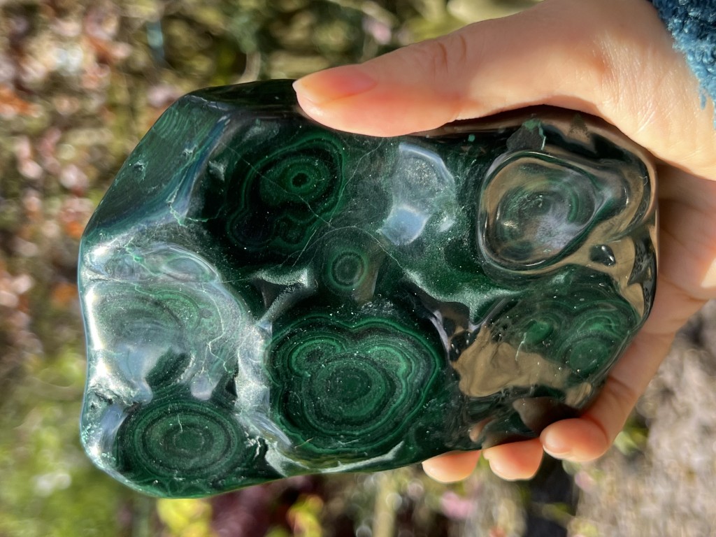 Malachite specimen Crystal weighing 1007g and measuring 150:110:30mm polished front. Beautiful, deep, swirling patterns within malachite, lovely biotrydal patterning within the crystal. Healing Stone for the Heart Chakra : Protection / Transformation / Emotional Healing A very powerful stone, malachite magnifies both positive and negative energies and is an important protection stone. Placed on the heart it brings balance and harmony and opens the heart to unconditional love. Malachite is a stone of transformation and encourages risk taking and adventure. It releases our inhibitions and helps with shyness and supports friendships. Placed on the solar plexus it can promote deep emotional healing. It stimulates dreams and memories. Malachite must only be used with the indirect method when preparing an elixir.