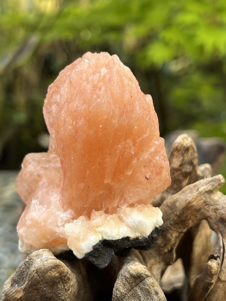 Orange / Peach Stillbite beautiful and rare. Weighing 118g and measuring 70:45:45mm Science & Origin of Stilbite Stilbite is a sodium calcium hydrous aluminum silicate that is a member of the family. This mineral crystallizes in the form of thin flattened plates, tabular crystals, as well as aggregates. Its commonly found in association with Apophyllite and Heulandite within basalt and other volcanic rock. Stilbite’s color is usually white but can be seen as brown, pink, yellow, orange, red or grey. This mineral was first discovered in 1797 by J.C. Delametherie, but wasn’t named until 1801 by R.J. Hauy. The finest Stilbite specimens are found in Western India, near the Poona region. Other notable localities include Iceland, Italy, Scotland, and the USA. The very rare mineral Cavansite is usually found formed on a bed of tiny Stibnite crystals in Poona, India. This combination mineral is extremely rare and and offers up some of the strongest energies from a stone we’ve ever come in contact with. When these 2 minerals meet, they create the ultimate dream stone that fully opens one third eye and crown chakra. These minerals together are extremely expensive and should only be bought from a reliable dealer to avoid purchasing a lower quality specimen that has been heat treated or dyed. Meaning & Energy Stilbite is a very compassionate stone whose soothing vibrations can be felt upon touch. Loving and healing vibrations emanate from Stilbite and fills the entire environment it’s placed in with joy, passionate, and uplifting energies. This stone connects our heart, third eye, and crown chakras together and helps one clearly see the emotions weighing on their heart space. Stilbite is here to help one heal from any pain and trauma they’ve been through, and release these bonds from our heart. Meditating with this stone will help soften these emotions, allowing one to see with clarity how it’s possible to move forward and grow from events that still hurt us to this day. The strengthened connection created between our heart and mind will also help one become much more in touch with their emotional body. One's mind will better understand their emotional side in the moment and learn how to deal with negative energies better.