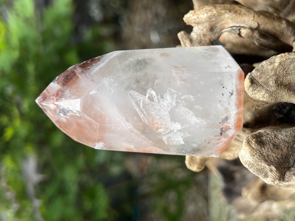 Amphibole Quartz Polished Point weighing 209g and measuring 82:49:38mm. Small hematite amphibole inclusions within these very clear points. See Angel on side of crystal. Amphibole Quartz, also known as, Angel Phantom Quartz is a variety of Quartz with various mineral inclusions that create the appearance of wispy Angel wings. A phantom is formed when a mineral or crystal deposit grows within an existing crystal whose growth was interrupted, but eventually starts growing again. Amphibole Quartz’s common phantom inclusions are Hematite, Kaolinite, Lithium and Limonite. Amphibole Quartz aligns with the Third Eye and Crown Chakras. It is a very high vibrational crystal that hastens our awareness allowing us to more easily access the spirit realm, lucid dream and do past life work. It fosters a deep connection to the Angelic realm granting us their guidance and the ability to communicate with our Guardian Angel. Amphibole Quartz radiates beauty and loving energy upon us to to fill our heart and spirit with pure joy.