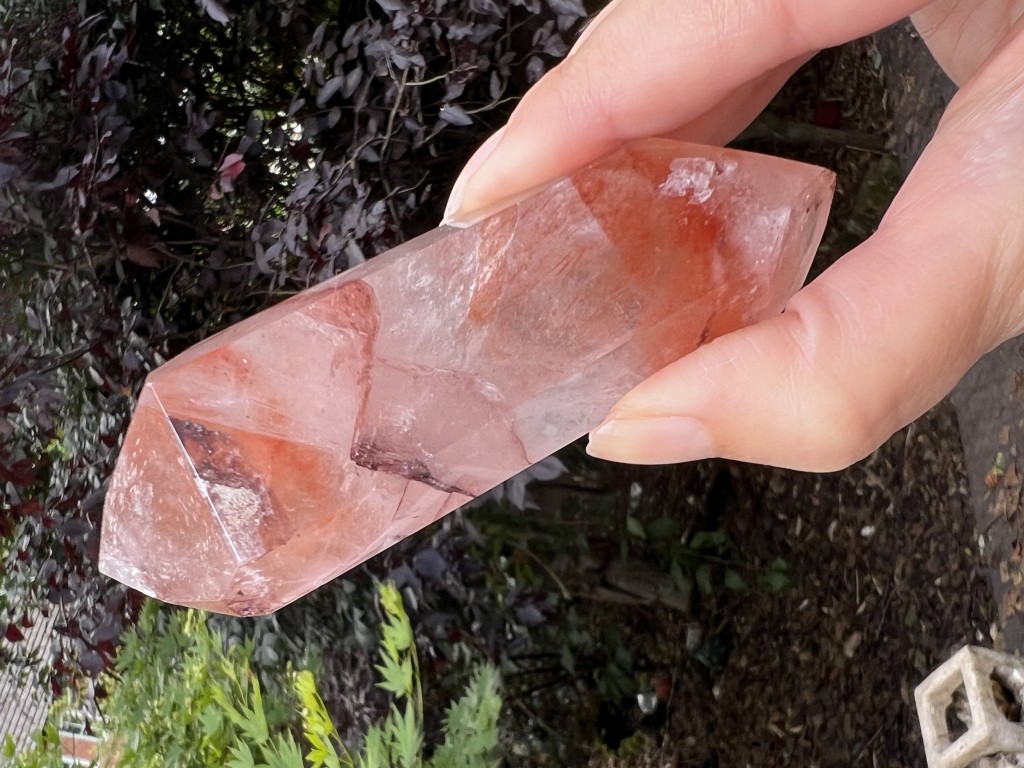 Amphibole Quartz Polished Double Terminated natural Point weighing 127g and measuring 97:34:28mm. Small hematite amphibole inclusions within these very clear points. Amphibole Quartz, also known as, Angel Phantom Quartz is a variety of Quartz with various mineral inclusions that create the appearance of wispy Angel wings. A phantom is formed when a mineral or crystal deposit grows within an existing crystal whose growth was interrupted, but eventually starts growing again. Amphibole Quartz’s common phantom inclusions are Hematite, Kaolinite, Lithium and Limonite. Amphibole Quartz aligns with the Third Eye and Crown Chakras. It is a very high vibrational crystal that hastens our awareness allowing us to more easily access the spirit realm, lucid dream and do past life work. It fosters a deep connection to the Angelic realm granting us their guidance and the ability to communicate with our Guardian Angel. Amphibole Quartz radiates beauty and loving energy upon us to to fill our heart and spirit with pure joy.