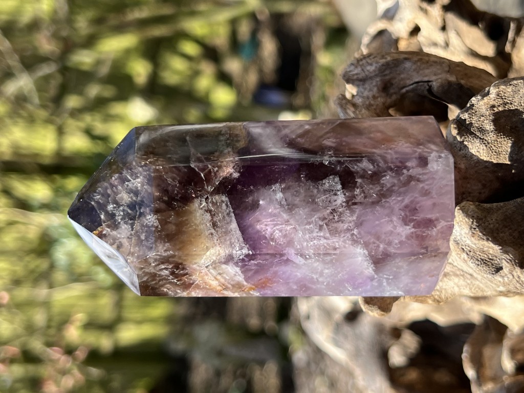 Super Seven Melody Stone point Large Specimen weighing 259g and measuring 99:47:31mm. Beautiful and powerful stone. Unusual colouring to this stone. This is a powerful and rare crystal found in only one place in the world, the Espiritu Santo region of Brazil. Ranging in colour from Smoky (almost black), Purple to crystal clear with colourful or golden inclusions. Super Seven contains a combination of Amethyst, Goethite, Cacoxenite, Clear Quartz, Lepidocrocite, Rutile and Smoky Quartz. This is a very special and powerful stone indeed and is extremely popular with crystal healers. This amazing stone never needs clearing, cleansing or recharging. The seven different minerals combine in this stone and work together in a synergistic manner. The result is that the Super Seven is far more powerful than these minerals would be individually. The Super Seven connects to all the chakras, aligning the energy fields and allowing high vibrational energy to flow freely throughout the body. In crystal healing, the Super Seven is used to give emotional support and to enhance overall health and wellbeing. The following individual crystal properties are combined and amplified within this stone: Amethyst – Highly regarded throughout the ages, Amethyst is a very powerful and protective crystal with strong healing and cleansing powers. Amethyst is an exceptional balancing crystal. As such, it helps to bring clarity of mind when our thoughts are scattered. It is perfect crystal for those who are overworked, stressed, anxious or simply feeling overwhelmed. It is used in crystal healing to relieve physical, emotional and psychological pain. Amethyst brings a wonderful, calming energy to the environment. It is also thought to enhance psychic abilities. Cacoxenite – Known as a stone of ascension. Cacoxenite harmonises personal will with the Higher Self and heightens spiritual awareness. Goethite – Strongly attuned to the healing power of nature, Goethite clears the earth and base chakras and helps to align the entire chakra system. Goethite facilitates a connection with the Universe and helps allows us to be open to receive necessary information. Lepidocrocite – Helps to balance the emotions. Lepidocrocite deepens our intuition and is a strength-giver, assisting in empowering and stimulating the mind. A stone of unconditional love. Quartz - Clear Quartz is considered the most powerful healing crystal on the planet. Clear Quartz has excellent metaphysical properties and a very strong vibration. It works on all levels of being and is a master healer for any condition, bringing balance and harmony to the mind and body. It is often used as an amplifier of energy and is therefore perfect to use alongside other crystals to increase their metaphysical properties. Rutile – A powerhouse of energy, Rutile amplifies the energies of all the crystals within the Super Seven. Smoky Quartz - is a very protective and grounding stone. It helps to restore emotional calmness and is a great stone to use for detoxification on all levels. A superb stone to use during times of stress, Smoky Quartz assists us during difficult times by gently dissolving any negative vibrations. It also brings in positive energy to the environment.