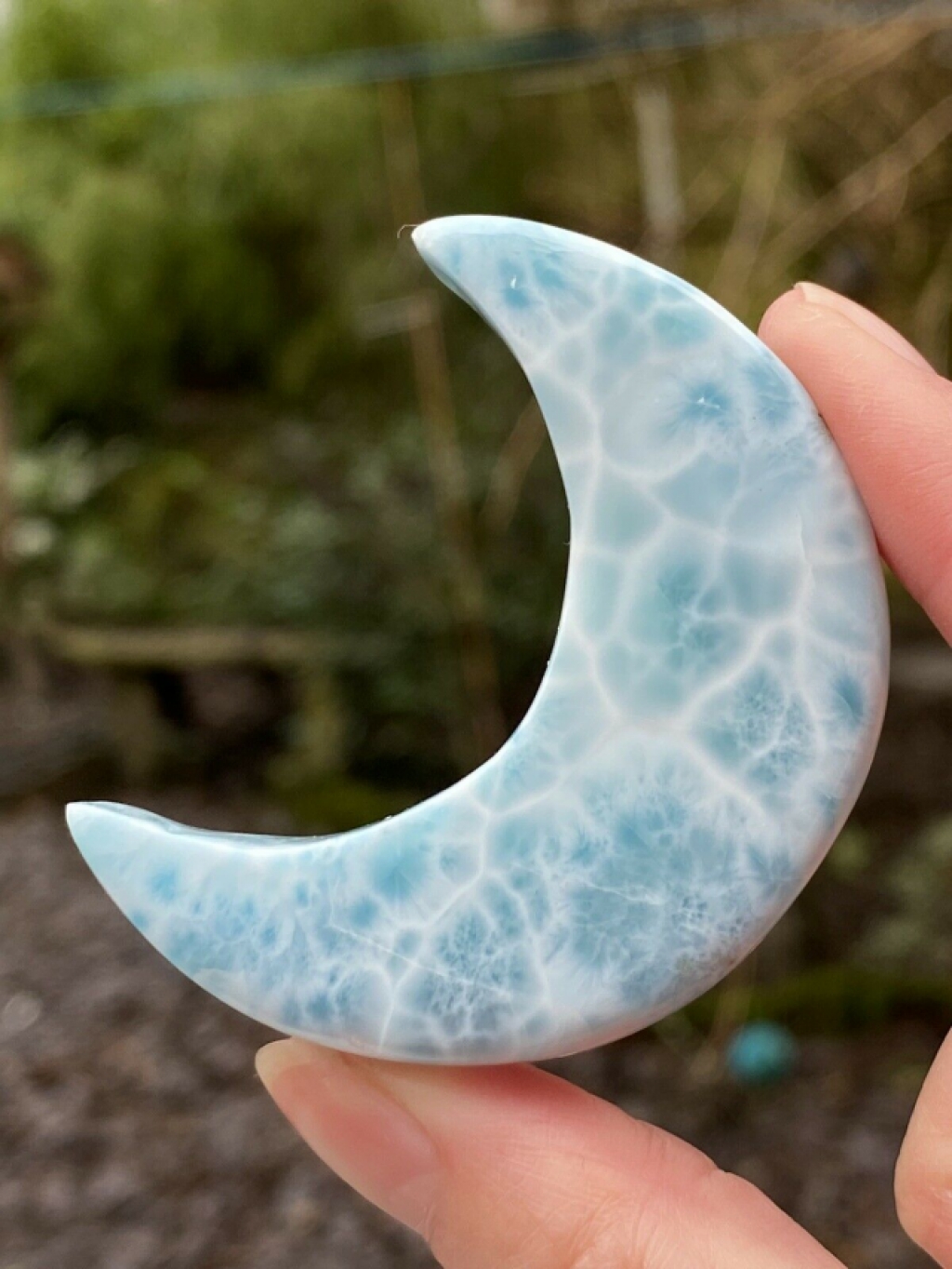 Large Larimar Beautiful Moon weighing 42.9g and measuring 55:41:12mm. This piece is direct from the miner in the Dominican Republic. Deep blues to this beautiful handcarved moon.