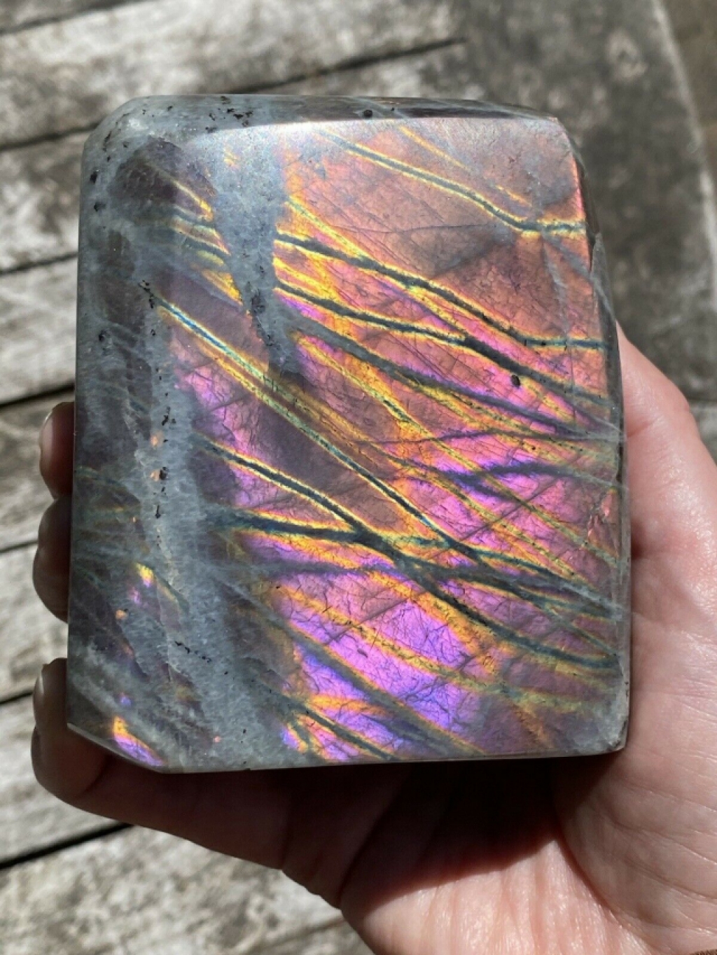 A large piece of rare pink orange ?sunset? labradorite crystal, weighing 724g and measuring 95:78:48mm. A beautiful iridescence to these labradorite crystals, taken in the spring sunshine, polished on their largest side to shown the sunset colours to their best effect.