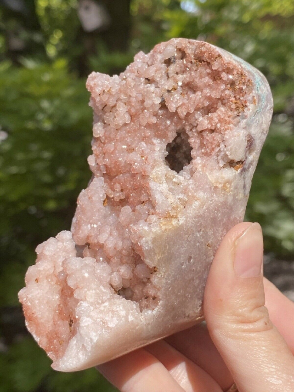 Large Patagonian Pink Amethyst Geode weighing 291g and measuring 87:58:53mm I love these beautiful sparkly pink amethysts, simply one of my favourite crystals for sale. This one has such wonderful open Druzy salmon pink patterns.