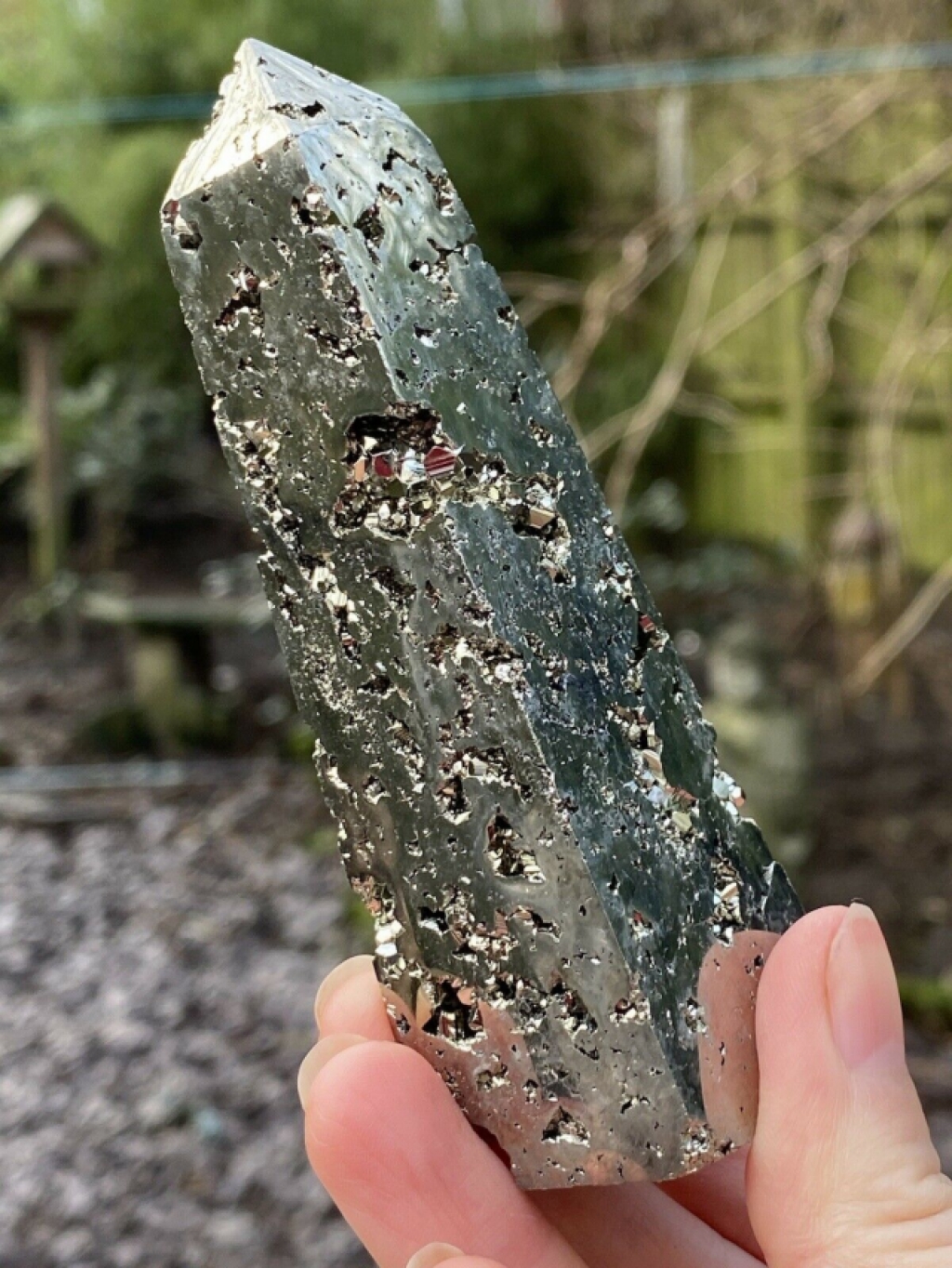 Iron Pyrite open cluster Large crystal point weighing 205g and measuring 101:29:28mm. Lovely colouring to these lovely crystal wands. Simply stunning pieces.