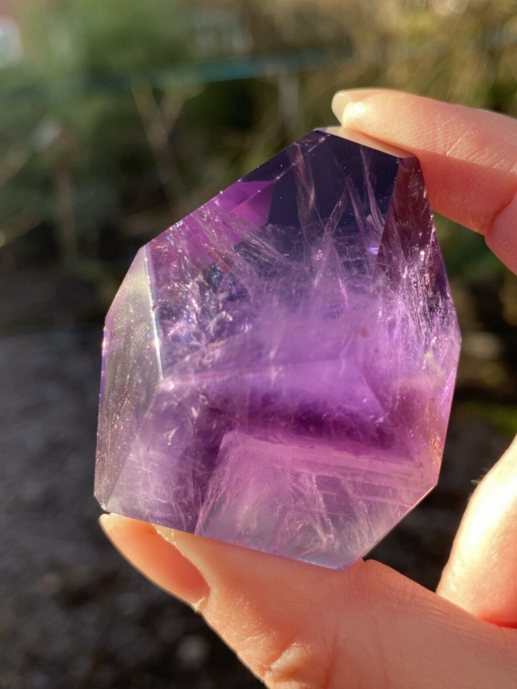 Large violet purple amethyst polished point weighing 66g and measuring 48:38:27mm. These are the highest grade and the deepest purple with rainbows within.