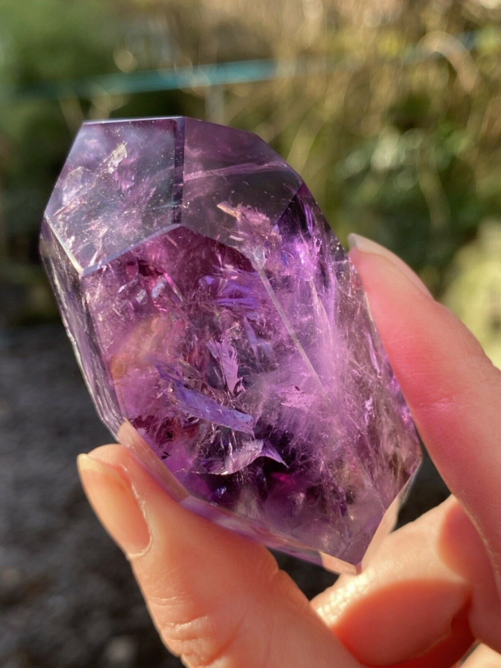 Large violet purple amethyst polished point weighing 104g and measuring 68:38:34mm. These are the highest grade and the deepest purple with rainbows within.